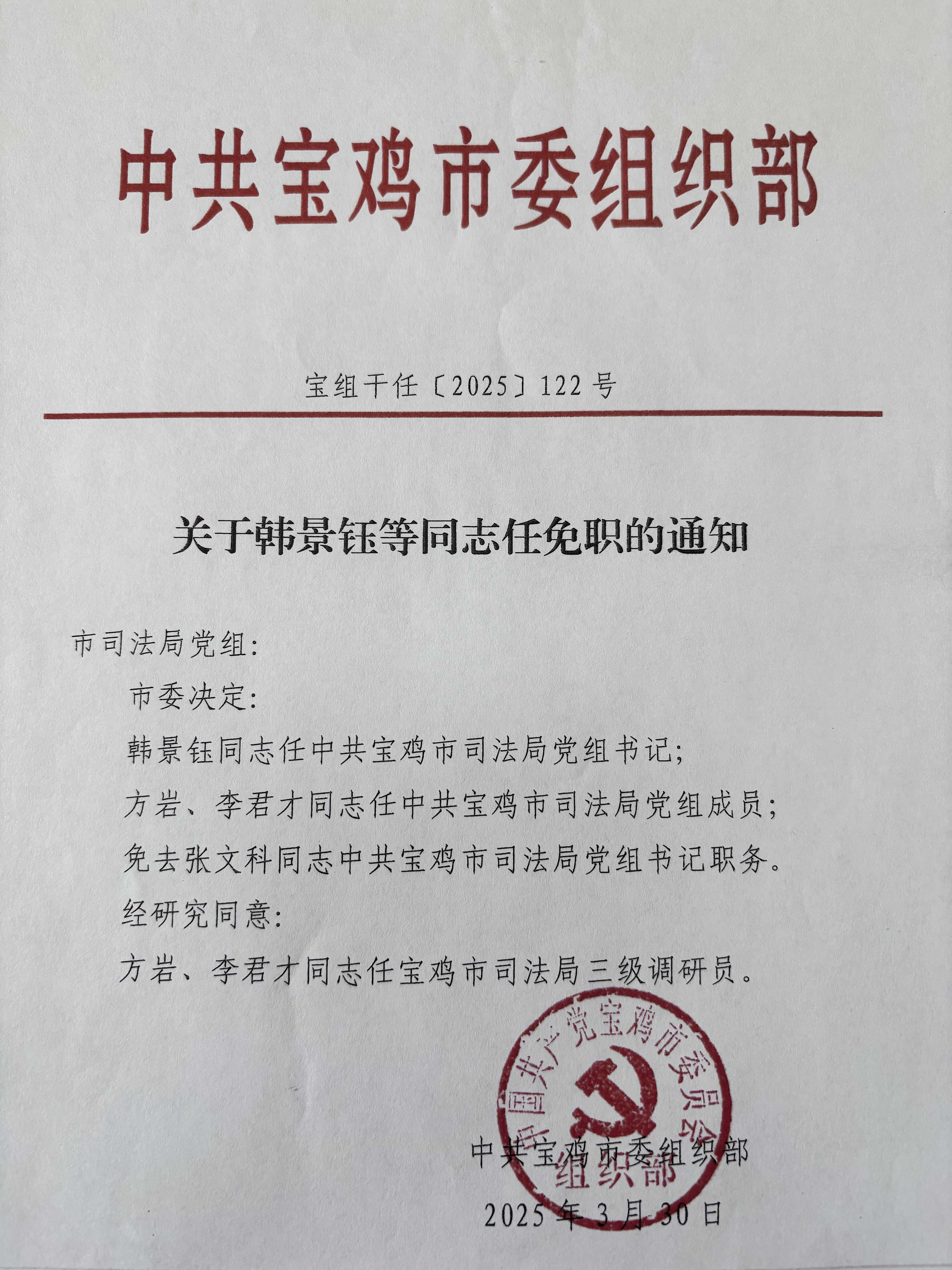 关于韩景钰等同志任免职的通知