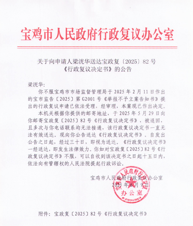 关于向申请人梁洸华送达宝政复[2025]82号《行政复议决定书》的公告