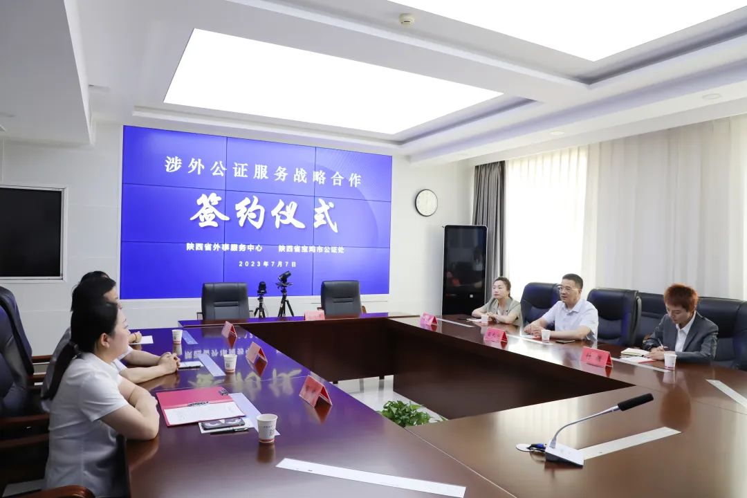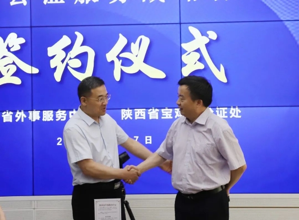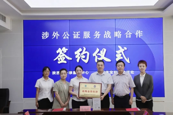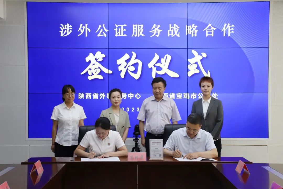 7月7日,宝鸡市公证处与陕西省外事服务中心在宝鸡市司法局指挥中心共同签署《陕西公证领事认证便民服务合作战略协议》,正式结为了战略合作伙伴关系。