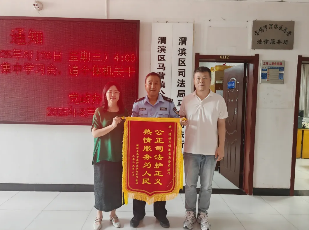 8月20日上午,某电力企业相关负责人为马营司法所送来一面写有“公正司法护正义、热情服务为人民”的锦旗,对该所成功调解一起亡人纠纷表示衷心感谢,并对调解人员专业公正、尽心尽责的工作态度致以高度赞誉。